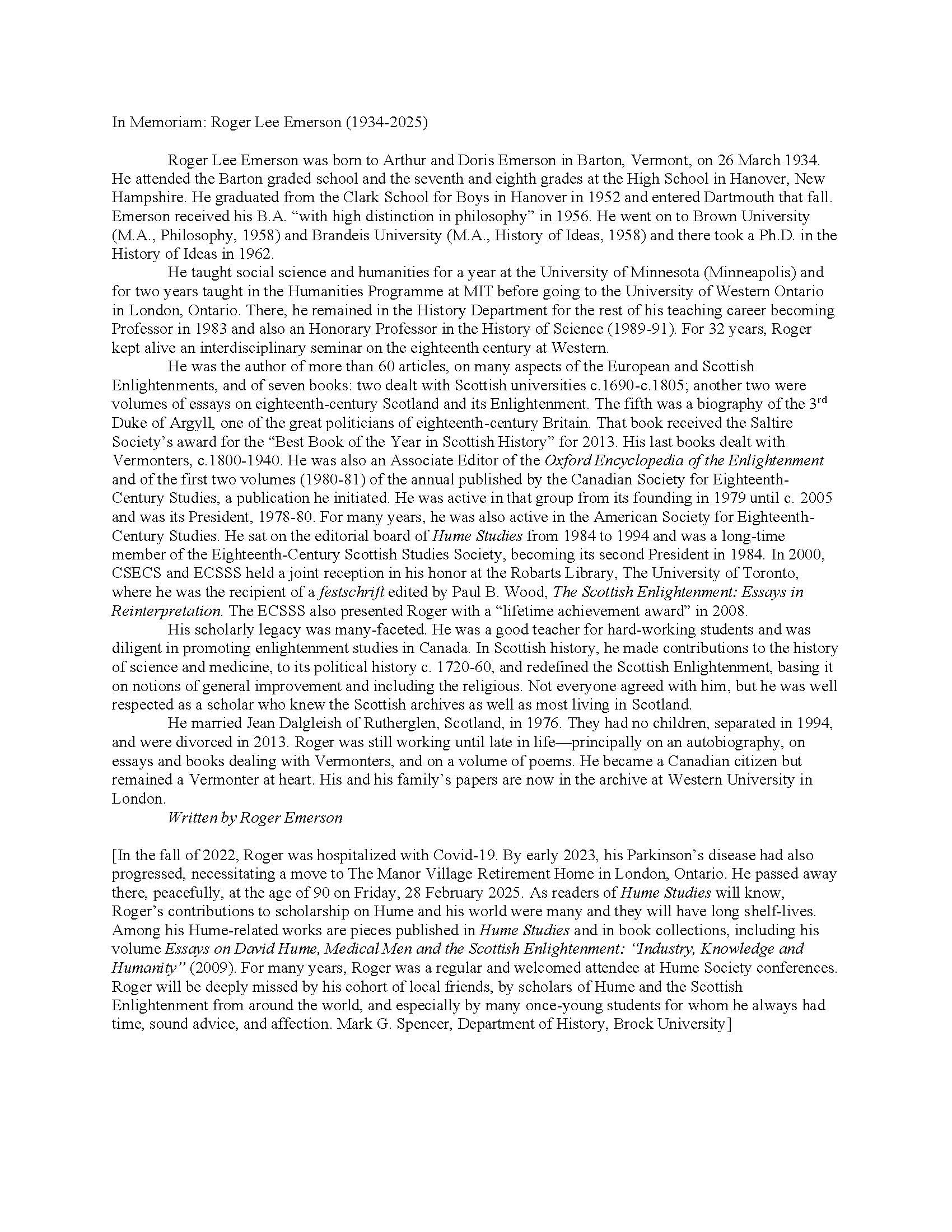 The Hume Society is saddened to announce the passing of Roger Lee Emerson (1934-2025). Emerson was, for most of his career, Professor of History at the University of Western Ontario in London, Canada. A specialist in the European and Scottish Enlightenments, Emerson was the author of over 60 articles and seven monographs, and (among many professional commitments) a member of the Editorial Board of our very own Hume Studies from 1984 to 1994. An accomplished scholar and excellent teacher, Emerson will be missed by all who knew him. An obituary composed by Roger Emerson, to which Mark Spencer has added an addendum, can be viewed below.